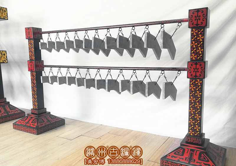 公司復(fù)原制作的24音編磬全長(zhǎng)1.8米,寬50厘米,高1.1米;演奏方便,音色亮麗,公司設(shè)計(jì)了編磬木桌放置編磬,長(zhǎng)2米,高70厘米,寬60厘米,陳列編磬后總高度:1.8米。木桌內(nèi)做儲(chǔ)藏柜,可方便樂(lè)隊(duì)保管其他樂(lè)器及服裝,方便實(shí)用。